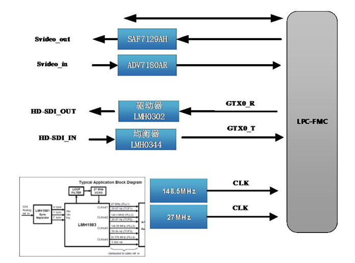 FMC板卡包含1路HD-SDI 輸入輸出,1路復(fù)合視頻輸入輸出,用于高清、標(biāo)清相機(jī)的產(chǎn)品測(cè)試及智能軟件開發(fā)。適配Xilinx公司開發(fā)板及本公司不同底板。  二、技術(shù)參數(shù) 板卡功能 | 參數(shù) | 內(nèi)容 | HD-SDI 輸入 | 芯片型號(hào) | FPGA的 GTX, HD-SDI IP | 路數(shù) | 1路 | 速率 | 1.485Gb/s、2.97Gb/s | 視頻 | 720P,1080P | 傳輸阻抗 | 75Ω | HD-SDI 輸出 | 芯片型號(hào) | FPGA的 GTX, HD-SDI IP | 路數(shù) | 1路 | 速率 | 1.485Gb/s、2.97Gb/s | 視頻 | 720P,1080P | 傳輸阻抗 | 75Ω | 復(fù)合視頻輸入 | 芯片型號(hào) | ADV7180 | 路數(shù) | 1路 | 視頻 | PAL | 傳輸阻抗 | 75Ω | 復(fù)合視頻輸出 | 芯片型號(hào) | SAF7129 | 路數(shù) | 1路 | 視頻 | PAL | 傳輸阻抗 | 75Ω | 板卡標(biāo)準(zhǔn) | FMC ANSI/VITA 57.1 – 2008 | 板卡尺寸 | 69X76.5mm;安裝孔大小為2.7mm | 板卡前面板 | 四路 HDBNC | 板卡重量 | | 板卡供電 | +12V@0.5A | 板卡功耗 | 2W | 工作溫度 | Industrial -20℃到+70℃ | 支持母板 | Xilinx board | V6、V7、KU、VU、 ZYNQ、ZU 開發(fā)板 | Orihard board | 136、270、367、288、330、274、3、9 |