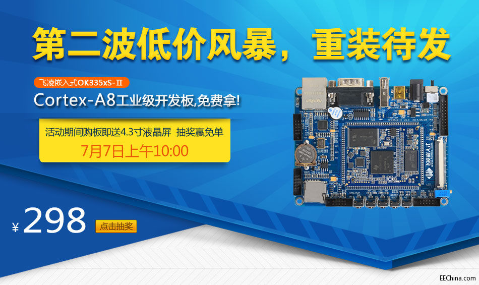 7月7日飛凌繼續(xù)送大禮,OK335xS-II開發(fā)板第二次優(yōu)惠購買即將開始,298超低價工業(yè)級開發(fā)板 ,有機會免費拿,更有返現(xiàn)驚喜等著你,小伙伴們快去關注吧,不要錯過這么好的購買機會哦!